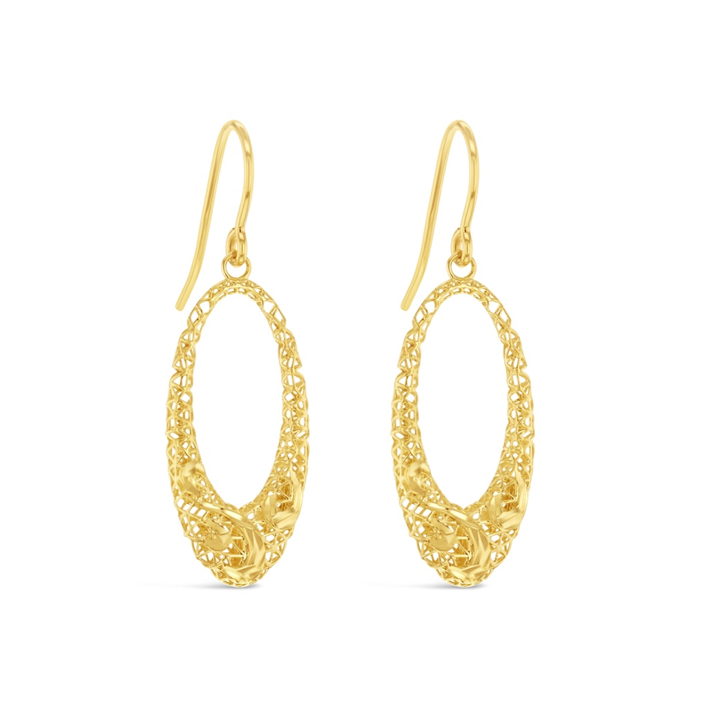 9Y POINTED OVAL HOOP WITH HOLLOW WEAVE PATTERN 11MM X 23MM WITH SOLID WIRE HOOK. 34MM DROP FROM TOP OF HOOK.